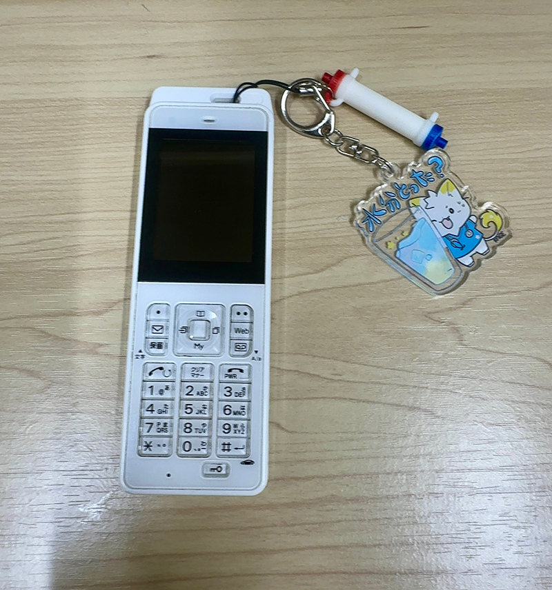 私のPHSです。撮影時は腎臓内科をローテーションしており、それを象徴するかのようにダイアライザーのキーホルダーをつけていました